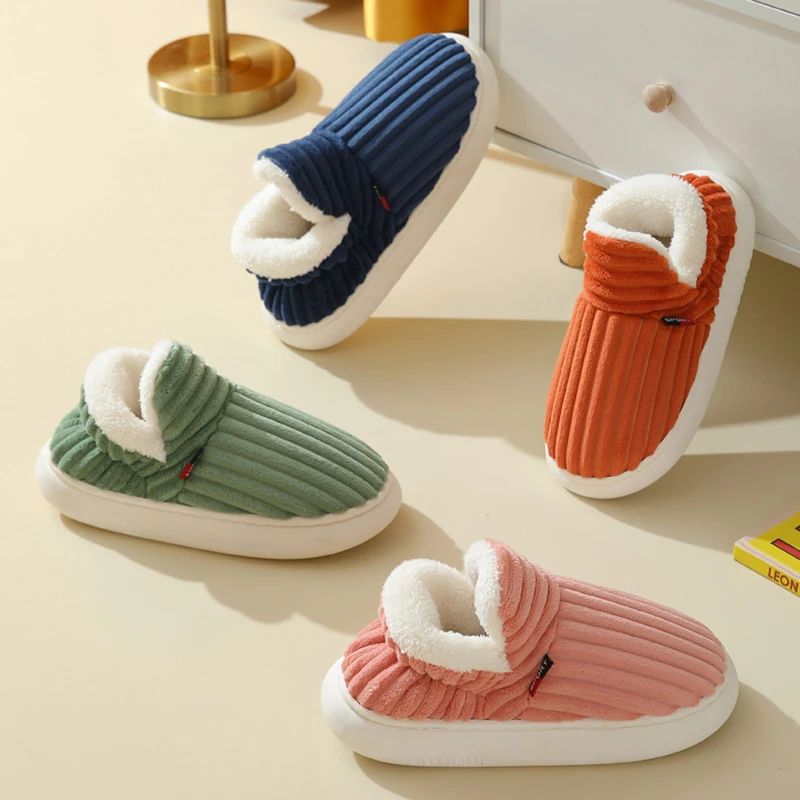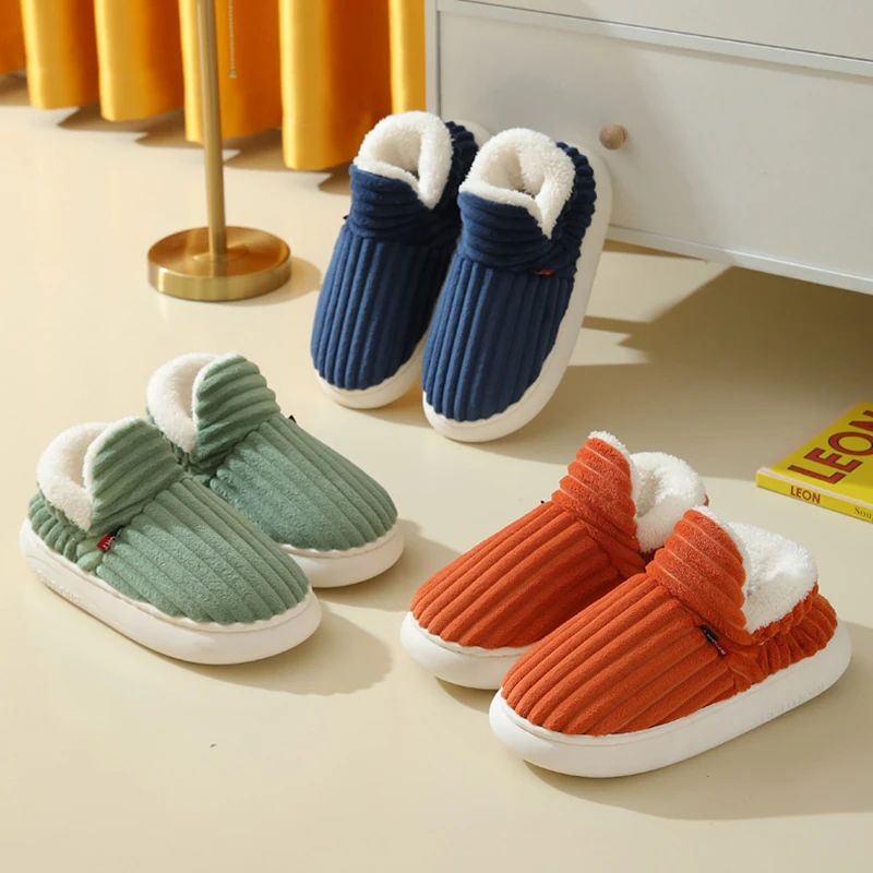 Das hochwertige Cord-Obermaterial verleiht den Hausschuhen ein modernes, elegantes Aussehen, während das weiche Plüsch-Innenfutter für ein kuscheliges Tragegefühl sorgt.